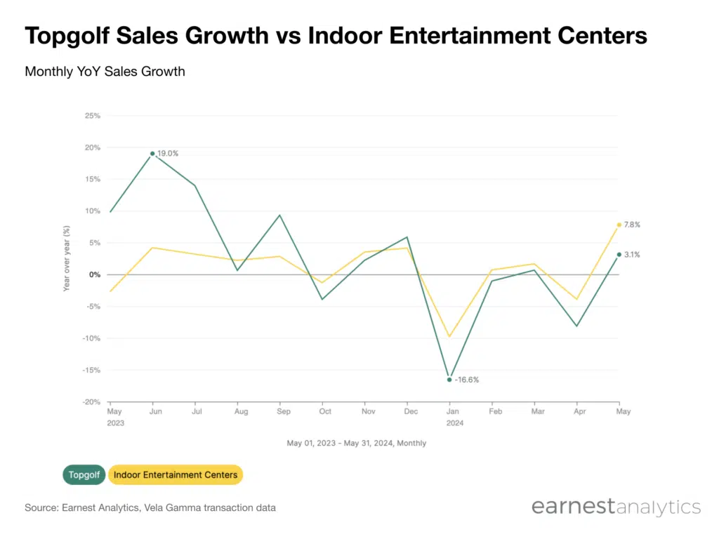 Topgolf’s May 2024 growth was in line with Earnest’s broader Indoor Entertainment Centers subcategory (includes Dave & Busters, Bowlero, and Punch Bowl Social), which grew 7.8% YoY.